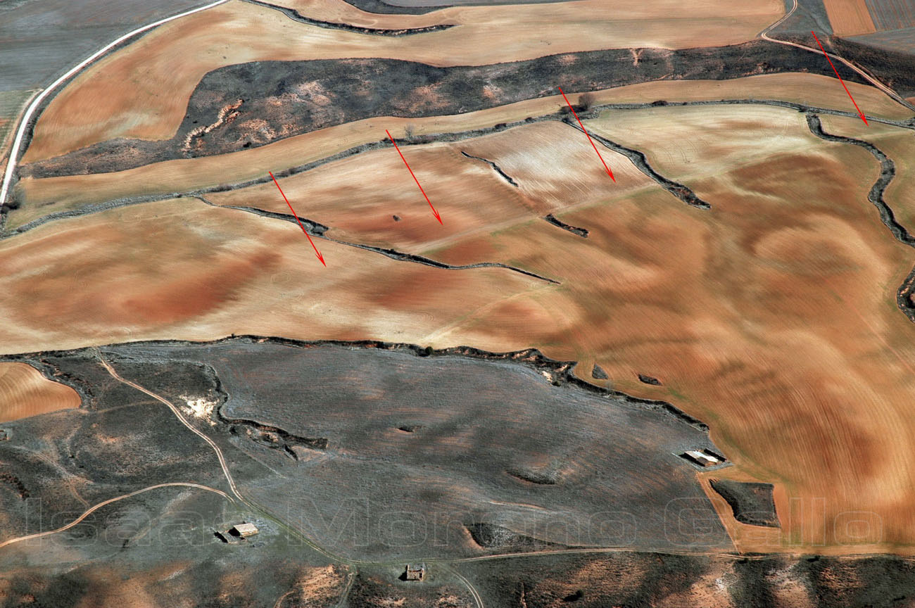 Vista aérea del tramo labrado de la Carretera de los Moros, en Zayas de Báscones (Alcubilla de Avellaneda). Cruce del río Perales. |